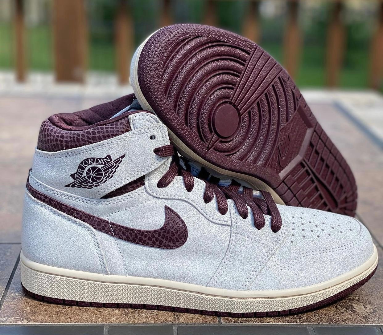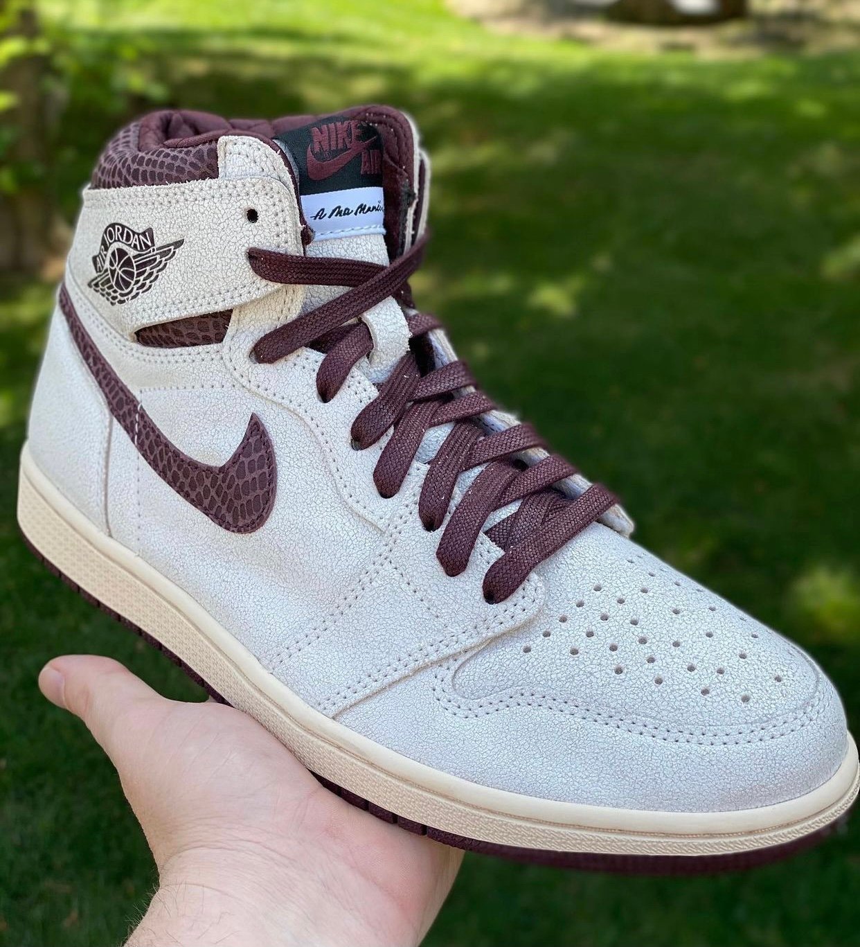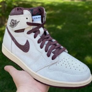 The A Ma Mani??re x Air Jordan 1 High OG represents the follow-up to the creative partners’ successful Air Jordan 3 collaboration from spring 2021. The iconic silhouette replaces traditional leather construction with a textured suede upper in a subtle off-white finish. Premium touches include burgundy snakeskin on the collar and Swoosh . along with a quilted satin lining in the same autumnal hue. A traditional Wings logo is stamped on the collar flap . the interior side of which features MJ’s signature and an inscription that reads ‘You have to expect things of yourself before you can do them.’ Additional branding includes a woven tongue tag marked with dual Nike Air and A Ma Mani??re logos. The high-top rides on a pre-yellowed midsole and burgundy rubber outsole.