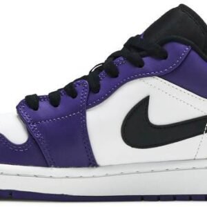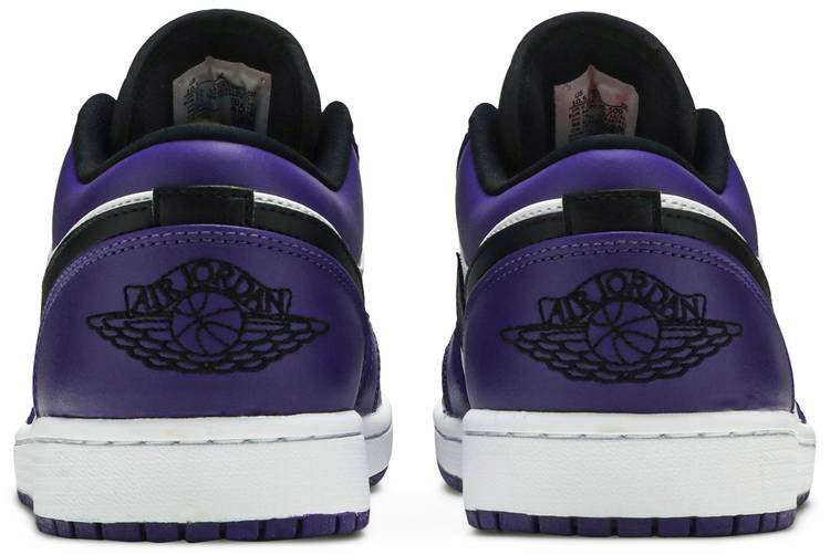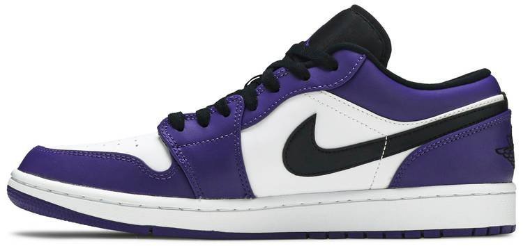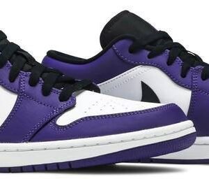 Jordan Brand gave the low-top treatment to one of its most popular Jordan 1 Highs to create the Air Jordan 1 Low Court Purple. The Air Jordan 1 Low Court Purple comes with color-blocking similar to the Jordan 1 High Court Purple White. The Court Purple features distinct purple overlays and a white leather base that gives it a timeless appearance. Extra details that enhance its look include a black nylon tongue . black laces . and a black leather Swoosh on the medial panels. The condensed Air-Sole element offers lightweight cushioning while its grooved outsole improves surface traction.