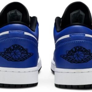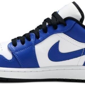 The Air Jordan 1 Low ‘Game Royal’ delivers a simple two-tone colorway of the classic silhouette. The upper combines a white leather base with contrasting royal blue leather overlays at the toe . eyestay and heel . the latter marked with a Wings logo in black embroidery. Additional branding elements include a leather Swoosh and Jumpman icon atop the tongue . both rendered in Game Royal. Encapsulated Air cushioning in the midsole provides a smooth ride.