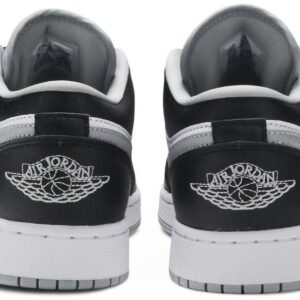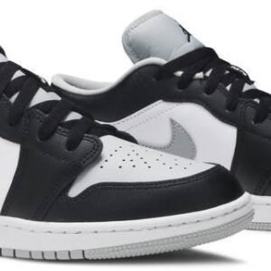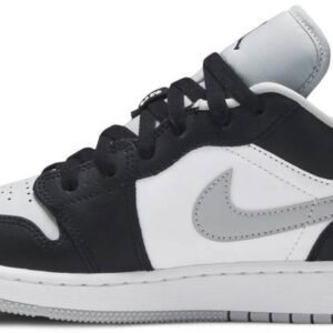 The Air Jordan 1 Low ??Smoke Grey?? is an ultra wearable colorway of Michael Jordan’s first signature shoe fitted in youth sizing. Made even more appealing in this neutral color scheme . the Air Jordan 1 Low is a fan favorite among sneaker collectors for its retro styling. The light grey leather perforated toe is contrasted by a black leather toe cap . eyelets . and forefoot overlays. Black tumbled leather appears on the collar and heel . and white leather can be found on the mid-panel . underneath the grey Swoosh. A traditional ??Wings?? emblem is located on the heel and a mini black embroidered Jumpman is placed on the tongue. The subdued look is capped off with a white midsole and grey outsole.