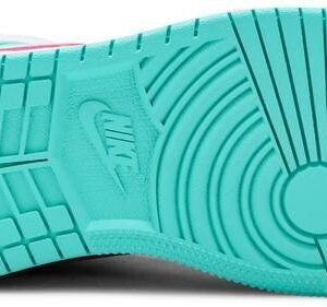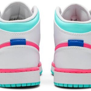 The Air Jordan 1 Mid GS ??Digital Pink?? is the youth sizing of Michael Jordan?s first signature shoe in a bright and vibrant colorway. Appearing on the Jordan 1 Mid . the upper displays smooth white leather on the forefoot . mid-panel . collar . and heel. Eye-pleasing Aurora Green leather can be found on the shoe?s perforated toe and underneath the collar overlay. A hue of pink leather called Digital Pink appears on the Swoosh branding on either side. Additional design elements include white speckled rope laces . a teal ??Wings?? logo on the collar . and pink detailing on the upper portion of the white rubber midsole.