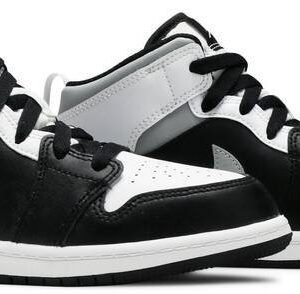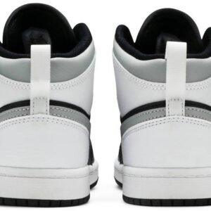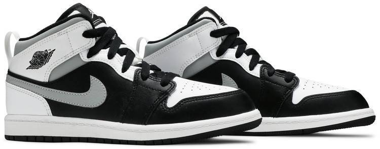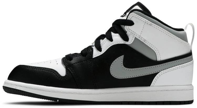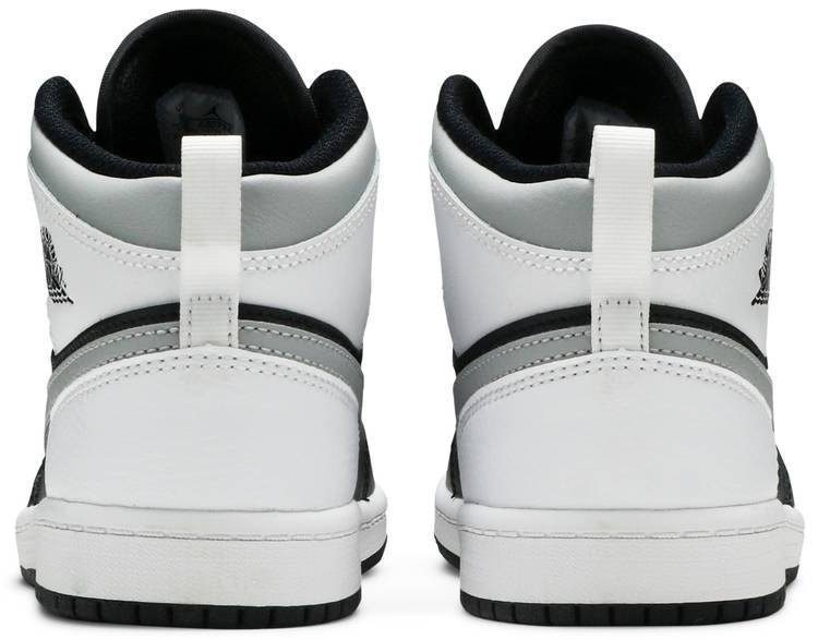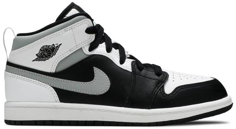 The Air Jordan 1 Mid PS ??White Shadow?? is the preschool sizing of Michael Jordan’s coveted first signature shoe in an easy-to-style colorway. The ??White Shadow?? appears on the Jordan 1 Mid silhoutte . one of the most popular looks in Jordan Brand’s line. Design details include buttery black leather on the toe cap . forefoot . and mid-panel. Contrasting white leather can be found on the perforated toe box . middle eyelet panel . collar . and heel. Branding appears in the form of a grey leather Swoosh on either side . a black ??Wings’?? emblem on the collar . and white Jumpman on the tongue tag sewn onto the white nylon tongue. The white pull tab on the heel is a helpful design that makes wearing and taking off the shoe a breeze.