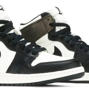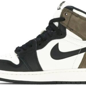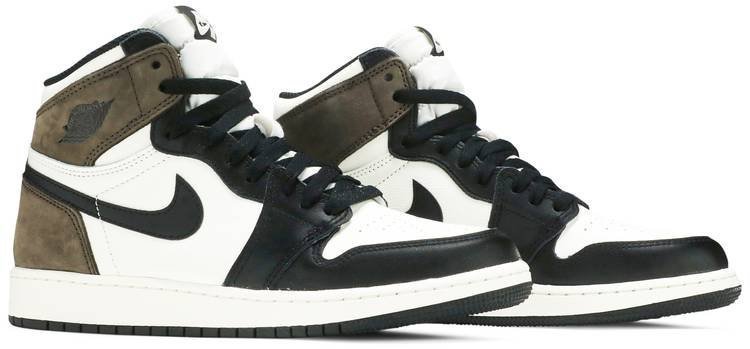 Made for big kids . the Air Jordan 1 Retro High OG GS ‘Dark Mocha’ features a non-traditional accent color that nonetheless figures prominently in the history of Jordan Brand. The rich brown hue appears on the nubuck heel overlay and collar flap . stamped with a classic Wings logo on the lateral side. The rest of the upper combines a white leather base with contrasting black leather overlays. Nike Air branding adorns the tongue tag.