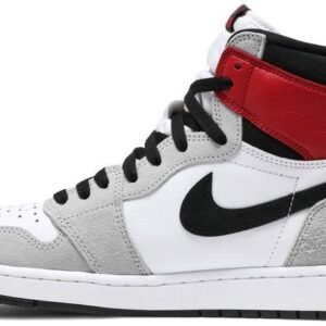 The Air Jordan 1 Retro High OG ‘Smoke Grey’ showcases a pop of Varsity Red on the ankle flap . stamped with a classic Jordan Wings logo on the lateral side. The rest of the upper is finished in strictly neutral tones . highlighted by a white leather base with grey suede overlays. A black Nike Swoosh is complemented by matching black hits on the collar and rubber outsole. Nike branding atop the white nylon tongue tag completes the OG aesthetic.