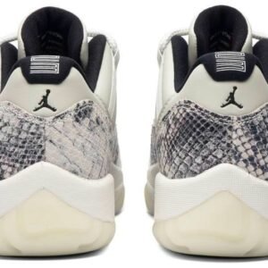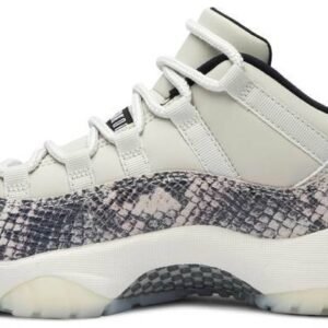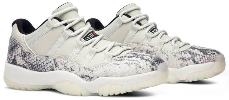 The Air Jordan 11 Retro Low’s iconic identity was founded when Michael Jordan returned to the game in 1995. Surfacing in June 2019 . this ‘Light Bone Snakeskin’ variant reaffirms the classic’s allure with a contemporary snakeskin print on the leather upper’s mudguard. Rope laces winding through the lateral webbing customize fit. Signature Jumpman insignias are positioned on the tongue and heel. A translucent rubber outsole and carbon fiber plate form the base.