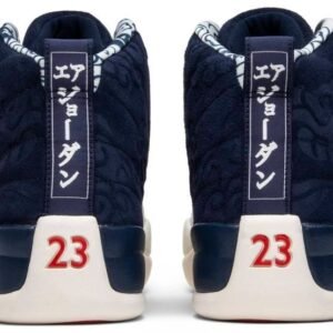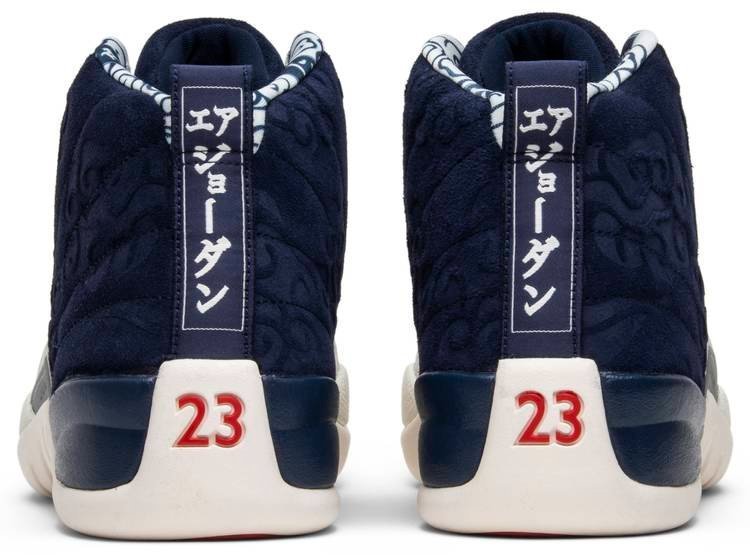Michael Jordan famously included a ‘Love of the Game’ clause in his contract to ensure that he could play basketball in the offseason. The stipulation saw him spend summers traveling the globe to promote the game in foreign countries through basketball clinics. Jordan Brand saluted these efforts with the International Flight Collection . a trio of shoes representing notable camps he took part in. This Air Jordan 12 colorway . honoring a 1996 trip to Tokyo . features a kimono-style print on the suede upper and a koi fish scale pattern on the mudguard. The characters on the heel translate to ‘Air Jordan.’