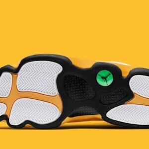 This Air Jordan 13 is expected to feature White leather on the panels . toe . and tongues with a matching liner. Other details include Yellow (Del Sol) suede overlays . Red appearing on the Jumpman tongue and outsole completed with a Black rubber sole.