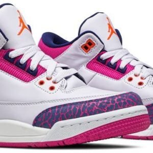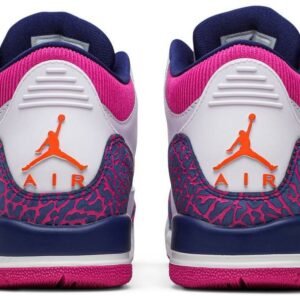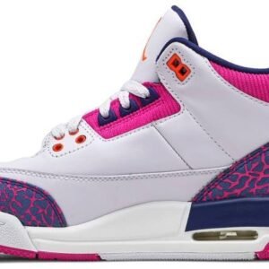 Air Jordan 3 Retro ‘Barely Grape’ features a white leather upper with the model’s iconic elephant-print overlays in a vibrant blend of purple and fuchsia. The latter hue is applied to the ribbed-textile collar and rubber outsole . while the Jumpman branding that adorns the tongue and heel is rendered in bright orange. The legacy silhouette is anchored by a foam midsole with a visible Air sole unit at the heel.