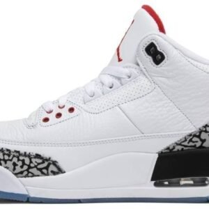 In celebration of Michael Jordan’s iconic launch from the free throw line thirty years ago during the 1988 Slam Dunk Contest . Jordan Brand released the Air Jordan 3 Retro NRG ‘Free Throw Line.’ The sneaker comes dressed in white with Cement Grey accents on the toe box and heel and Fire Red detailing on the eyelets and on the tongue. The model also boasts a translucent sole with a red stripe . exactly where MJ took off from the line. Other details include “3:51” lettering on the back pull tab to remember the time Jordan took flight . and “147” on the tongue as a nod to his final score.