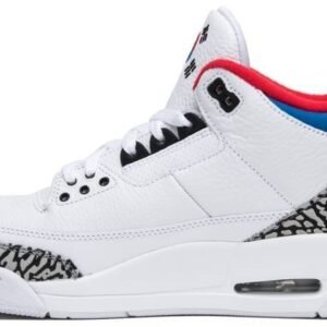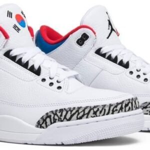This iteration of the Air Jordan 3 commemorates the 1988 Olympics in Seoul. Taking inspiration from the South Korean flag . the shoe features black . red . and blue accents on the inner lining and collar. The white upper . constructed from tumbled leather . includes the Jordan 3’s signature elephant print panels. Korean characters appear on the inside of each tongue: ” (Seoul) on one side; the 1988 games motto . ‘ ‘ (Harmony and Progress) on the other.