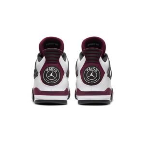 The Air Jordan 4 PSG “Paris Saint Germain” is a desirable collaboration between the European football club and Jordan Brand on Michael Jordan’s fourth signature shoe. Paris Saint Germain, or simply “PSG,” has received special colorways of classic Air Jordans since inking a sponsorship deal with Jordan Brand in 2018. The upper features smooth white leather on the mudguard, which spans from the heel to the toe. Tumbled white leather can be found around the eyelets, collar, and heel. Subtle light grey nubuck detailing is located on the toe. White netting is layered over a black synthetic material on the tongue and mid-panel. Bordeaux accenting comes into play on the plastic lace holders and midsole walls. The burgundy hue can also be found on the underside of the tongue and on the heel. Dual “Paris Saint Germain” and Jumpman detailing dots the heel, while an added “Paname” (another word for Paris) tab is found near the toe.
