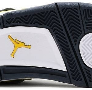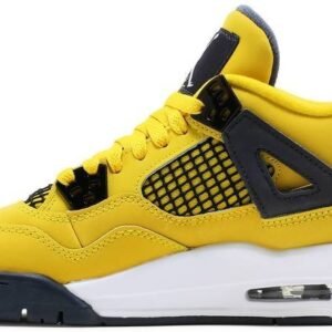 The 2021 edition of the Air Jordan 4 Retro GS ‘Lightning’ brings back a sought-after 2006 colorway in grade school sizing. Like the original . the mid-top makes use of a bright yellow nubuck upper with black molded eyelets and matching black netting on the quarter panel and throat. Dark grey accents settle on the wings . interior tongue . and molded Jumpman logo on the heel overlay. A second Jumpman icon decorates the woven tongue tag. The sneaker is mounted on a white foam midsole with visible Air-sole cushioning in the heel. A grey rubber outsole features a grippy herringbone traction pattern underfoot.