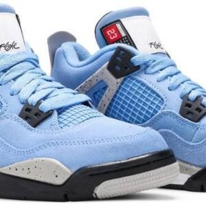 Crafted for big kids . the Air Jordan 4 Retro GS ‘University Blue’ carries a suede upper in a familiar color that nods to Michael Jordan’s alma mater . the University of North Carolina at Chapel Hill. The collegiate theme is reinforced with a woven jock tag on the tongue . featuring a design similar to the labeling on throwback Nike basketball jerseys. Speckled grey detailing lands on the sneaker’s supportive wings . PU midsole and molded heel tab . the latter embellished with Jumpman branding.