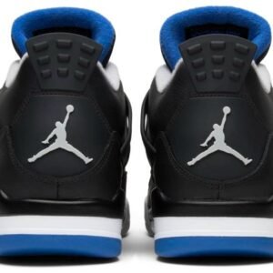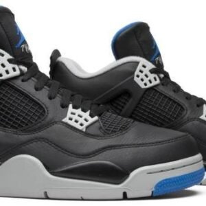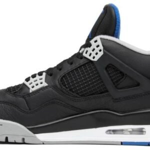 The Air Jordan 4 Retro ‘Motorsports Alternate’ released in 2017 alongside the mostly white ‘Motorsport’ colorway . inspired by MJ’s motorcycle racing team and modeled after a hyper-limited colorway gifted to the team’s 16 members back in 2006. This pair features a black leather upper with contrasting Matte Silver detailing on the molded eyelets . collar lining and Jumpman heel logo. A second Jumpman icon graces the woven tongue tag in Game Royal. A polyurethane midsole with visible Air cushioning anchors the classic mid-top silhouette.