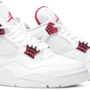 Launching as part of a four-piece Metallic Pack . the Air Jordan 4 Retro ‘Red Metallic’ treats the classic silhouette to a simple two-tone color scheme. The upper is constructed from white leather . complete with standard details that include quarter-panel netting and a visible Air sole unit at the heel. Contrasting pops of University Red appear on the molded eyelets . interior tongue and Jumpman branding hits at the heel and woven tongue tag.