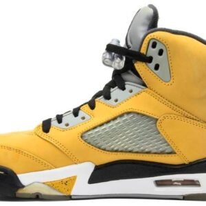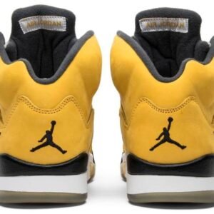 To celebrate the opening of the Jordan Tokyo 23 store in Japan . Jordan Brand prepared a special rendition of the Jordan 5. Constructed with a yellow suede upper . the shoe is accented by Wolf Grey on the tongue . eyelets and webbing on the quarter panel. Hits of black on the toe . heel and laces provide contrast . as does the Japanese character embroidered on the heel.