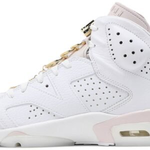 The women’s Air Jordan 6 Retro ‘Gold Hoops’ adds gilded accents to the shoe that Michael Jordan wore when he clinched his first ever NBA championship. The vintage mid-top carries a white tumbled leather upper with Barely Rose hits on the tongue . heel tab and midsole . fitted with a visible Air-sole unit in the heel. Metallic gold lace locks are matched by a trio of earring-inspired gold hoops . with a Jumpman charm attached to the lowest ring via a short gold chain. Underfoot . milky translucent rubber is utilized on the outsole.