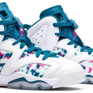 The story of the Air Jordan 6 Retro GS starts when Michael Jordan locked in his second MVP title in 1991. Emerging in March 2019 . this ‘Green Abyss’ kids’ exclusive updates the icon in a tumbled leather upper with a printed nylon sleeve seen through the lateral windows. Classic tooling arrives via a dual-functioning tongue with a neon Jumpman . quick-pull lacing and a TPU heel pull. A visible Air unit and translucent outsole serve up signature distinction.