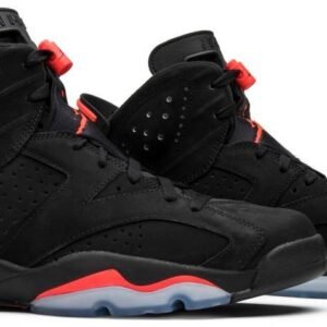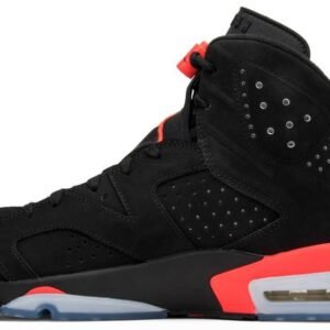 In 1991 the Air Jordan 6 released in five original colorways . one of which was the legendary Air Jordan 6 ‘Infrared’ sneaker. Retro releases dropped in 2000 . 2010 . and in 2014 to commemorate the 23rd anniversary of the shoe’s initial release date. The design features an all-black perforated upper in nubuck leather with infrared accents throughout and a return to the reflective upper underlay . a detail not seen since the shoe’s original release.