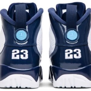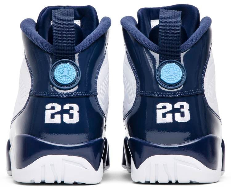 The Air Jordan 9 Retro ‘UNC’ features a familiar colorway that pays tribute to Michael’s University of North Carolina alma mater. Specifically . the design replicates an Air Jordan 9 Low from 2002 . with the shoe sporting a white leather upper that’s complemented by Midnight Navy overlays in patent leather. Pops of University Blue are utilized on the Jumpman logos that adorn the midsole and sockliner.