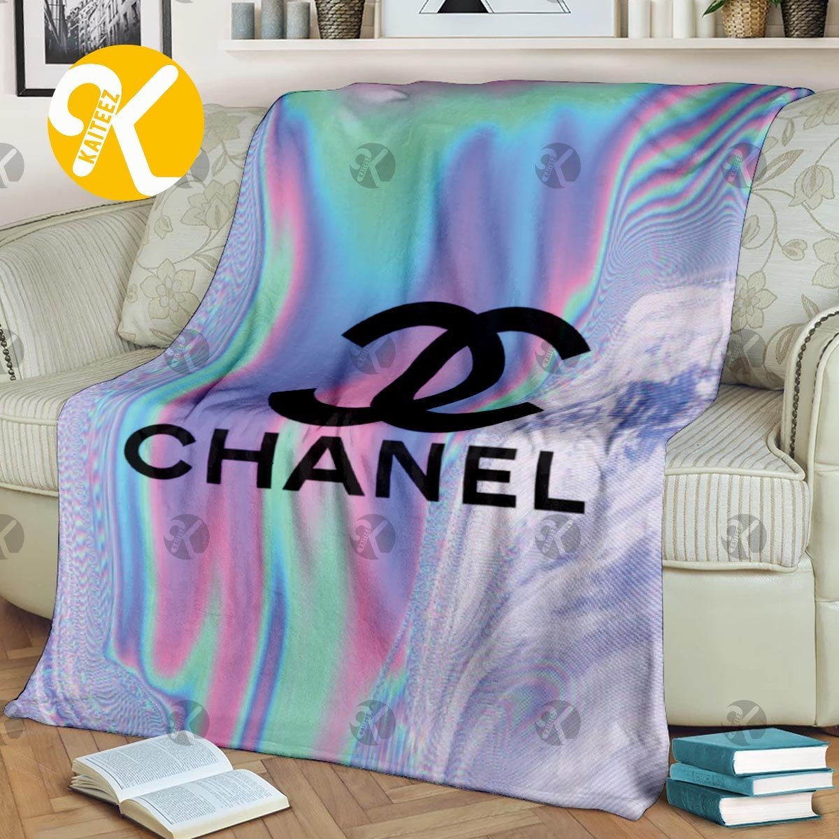 Chanel Big Signature Logo In Colorful Hologram Background Effect Blanket