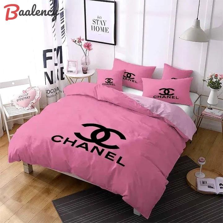 Chanel light pink printed bedding sets quilt sets duvet cover luxury brand bedding decor bedroom sets best luxury bed sets gift thankgivings and christmas Bedding Sets
