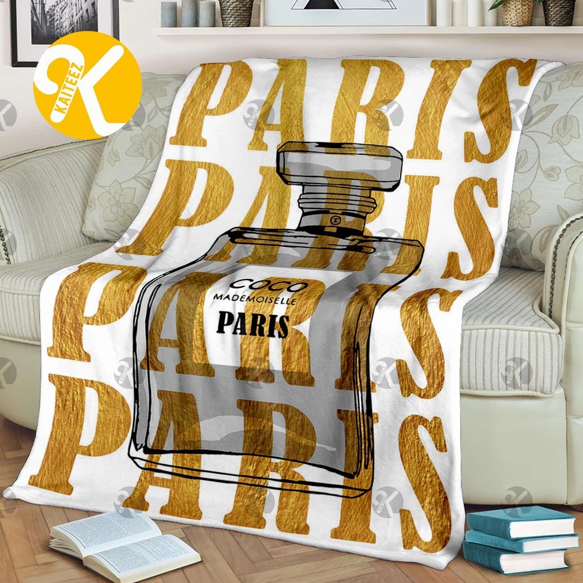 Chanel No.5 Black Perfume Bottle With High Fashion Golden Paris Pattern In White Background Blanket