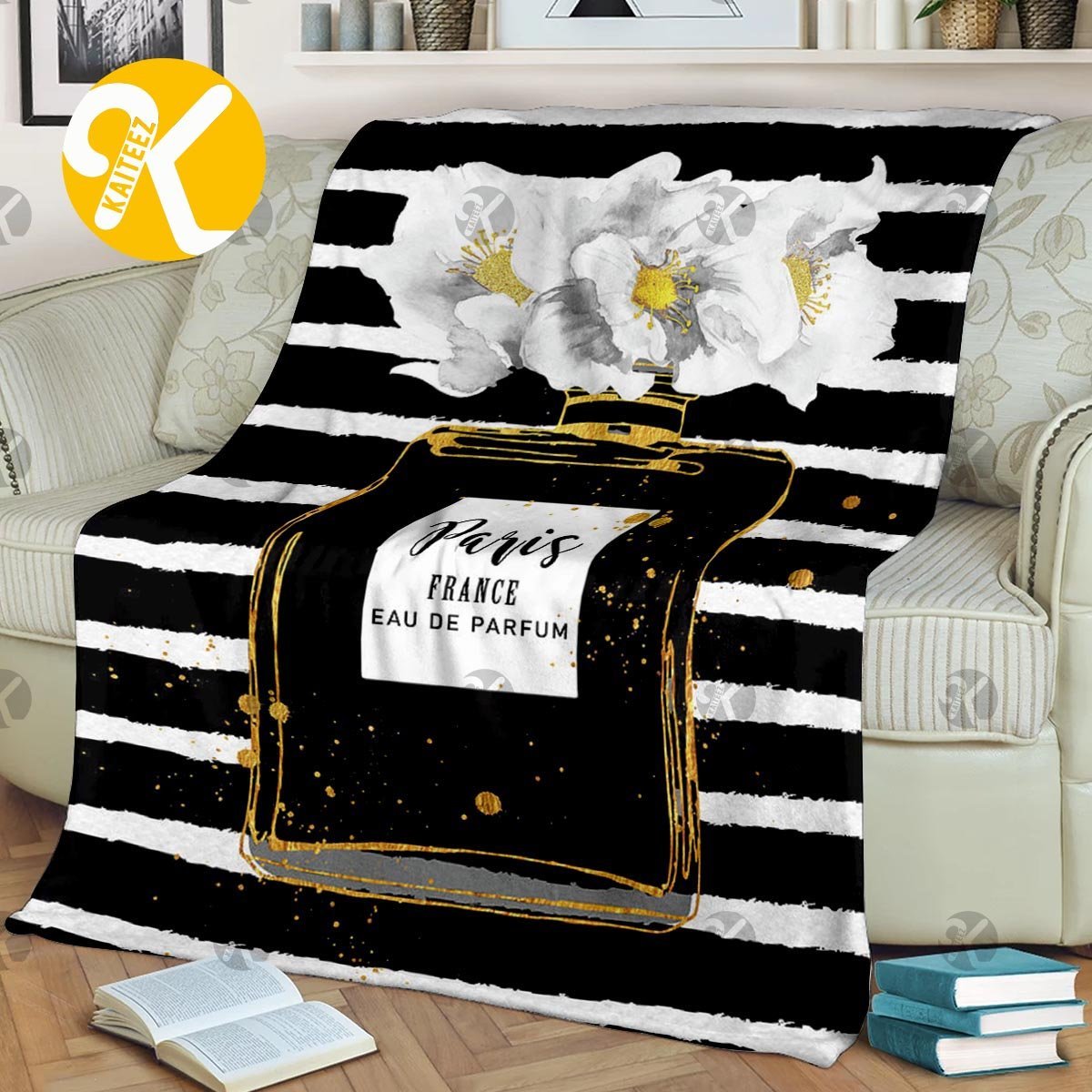 Chanel No.5 Black Perfume Bottle With White Flowers In Black And White Stripes Background Blanket