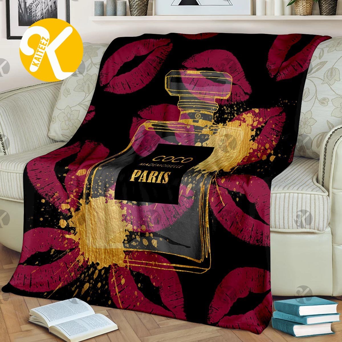 Chanel No. 5 Golden Perfume Bottle With Pink Llips Pattern In Black Background Blanket