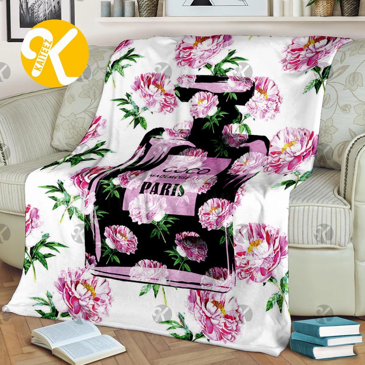 Chanel No.5 Perfume Bottle With Peonies Pattern In White Background Blanket