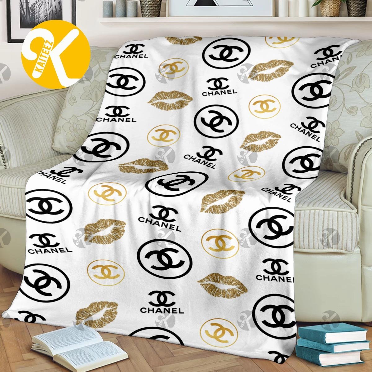 Chanel Signature Logo Patten With Golden Lips In White Background Blanket