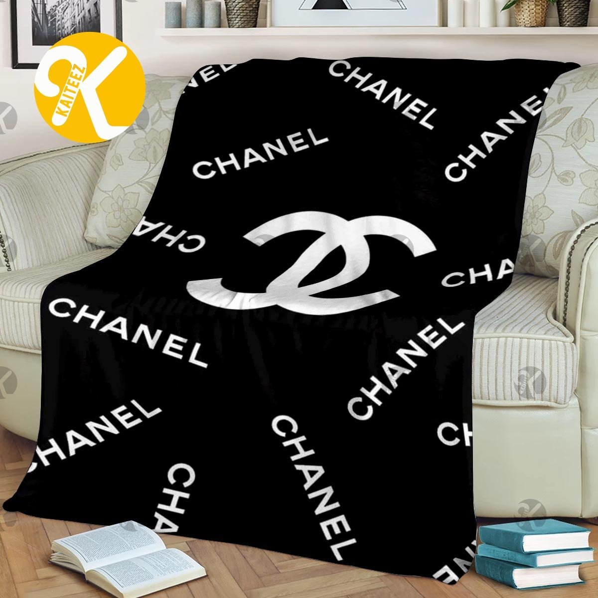 Chanel White Big Logo With Chanel Pattern In Black Background Blanket