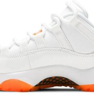 The women’s Air Jordan 11 Retro Low ‘Bright Citrus’ revives a simplistic two-tone colorway initially released in 2001 and previously reissued in 2015 as a kids’ exclusive. The low-top utilizes a white leather upper with webbing lace loops and a shiny patent leather overlay in a matching white finish. Vibrant orange accents stand out on the sneaker’s branding elements . including an embroidered Jumpman on the heel tab. Lightweight cushioning is provided by a Phylon midsole . reinforced underfoot by a carbon fiber spring plate and a translucent orange rubber outsole.