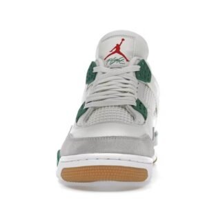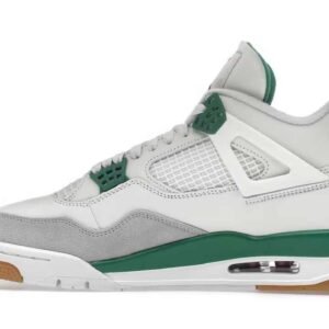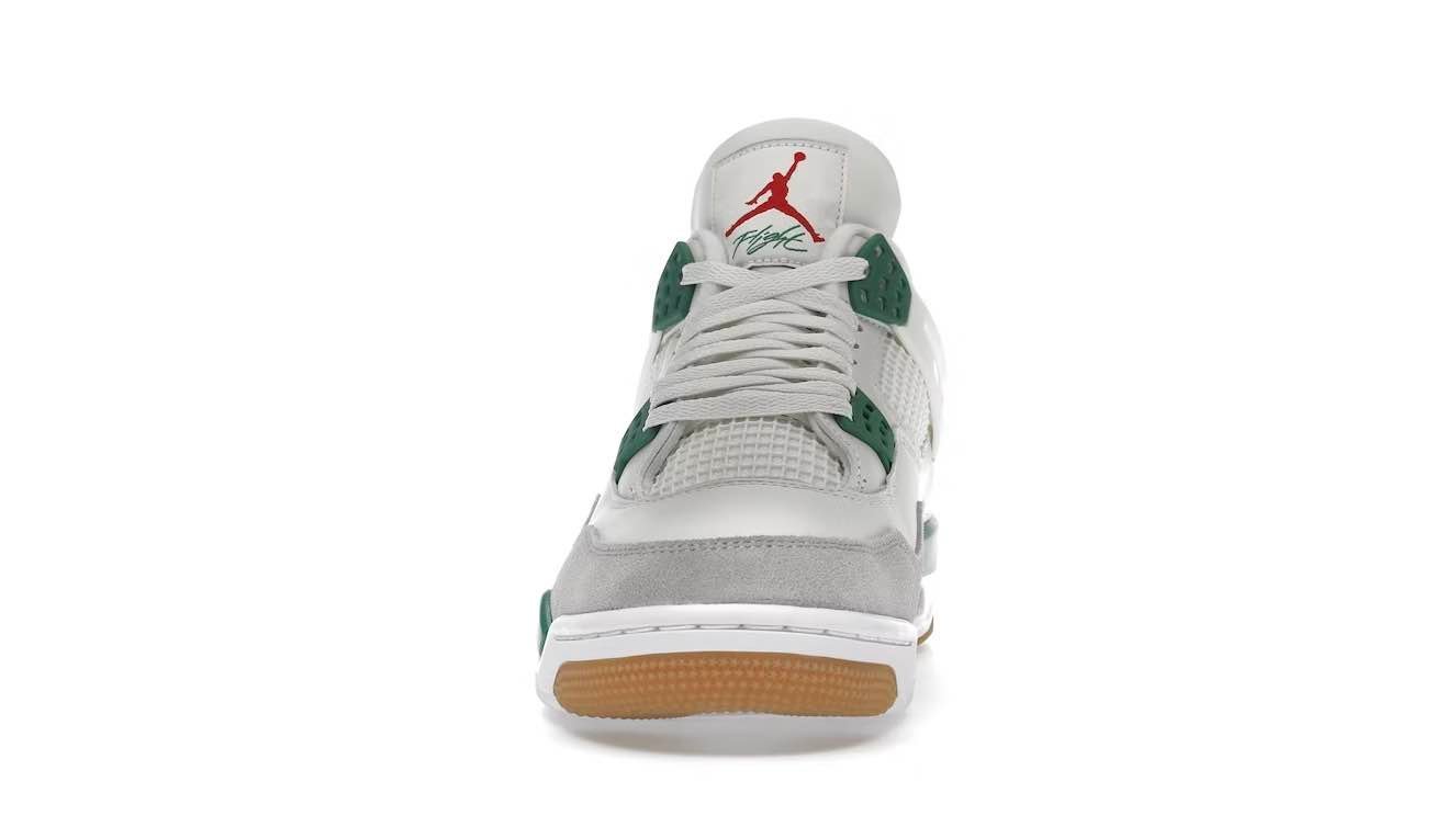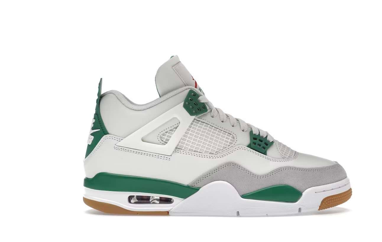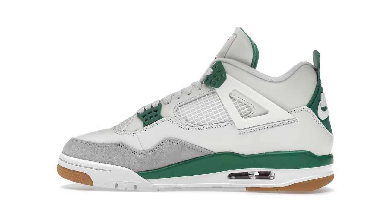 The Jordan 4 Retro SB Pine Green used a white leather upper with a Neutral Grey suede mudguard. The limited edition sneakers sit on top of a white and Pine Green midsole which is highlighted by a red air unit. Nike used a gum outsole to help with increased grip while skateboarding.