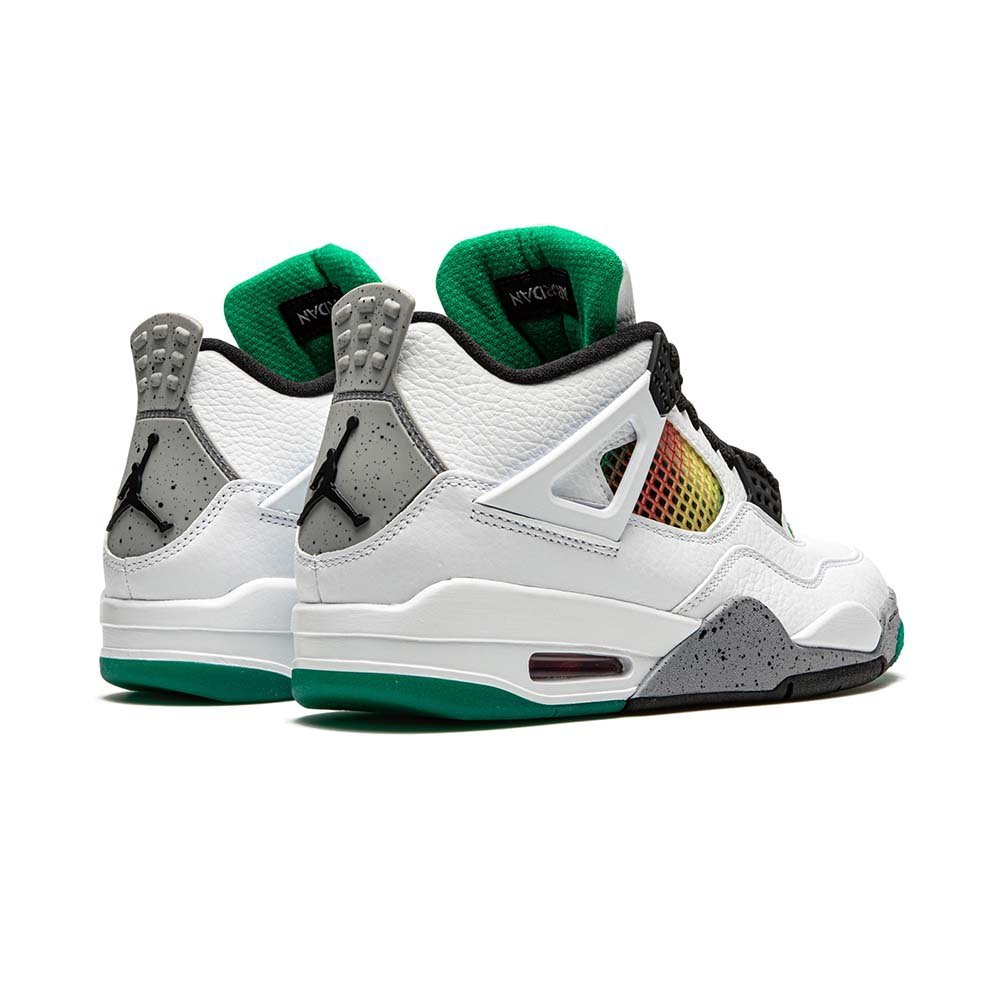 The Women’s Air Jordan 4 “Rasta” celebrates Jamaica Carnival, a festival of color, music, dance, and food, that takes place annually in Kingston, Jamaica. Appearing in women’s sizing, the Jordan 4 “Rasta” features charming overtures to reggae culture by displaying the colors of the Rastafarian movement on the netting found on the tongue and mid-panel. Black accents are found throughout, including for the Jumpman logo patch on the tongue, lace eyelets, and outsole. White leather forms the base of the shoe as it is featured on the toe, mid-panel, and heel. The shoe incorporates elements reminiscent of the “White/Cement” Jordan 4, namely the grey speckled midsole and heel tab.