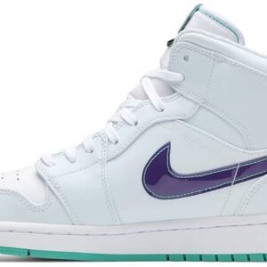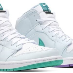 Launching as part of a three-piece Pregame Pack highlighting how athletes prepare for competition . the Luka Doncic x Air Jordan 1 Mid SE ‘Mindfulness’ draws inspiration from the NBA star’s tranquil headspace in the locker room. The mid-top’s pristine leather build is accented with mismatched green and violet coloring on the signature Swoosh and rubber outsole. ‘Breathe and Center’ is inscribed on the heel of the left shoe . ‘Center and Breathe’ on the right.