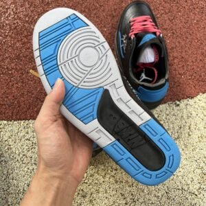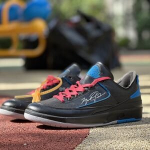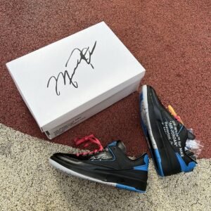 With the release of the Off-White x Air Jordan 2 Retro Low SP ‘Black .’ a relatively unheralded silhouette gets the Virgil Abloh treatment. The low-top carries a black leather upper with a tonal lizard-textured overlay and contrasting royal blue accents. They land on the molded heel panel . midfoot piping and exposed-foam tongue . featuring the Jordan Wings logo for an OG touch. Michael Jordan’s signature is scrawled across the lateral side . while Abloh leaves his mark with a plastic zip tie . medial-side Helvetica text and ‘SHOELACES’ printed on the laces. Faux cracking on the midsole gives the shoe an aged . distressed aesthetic.