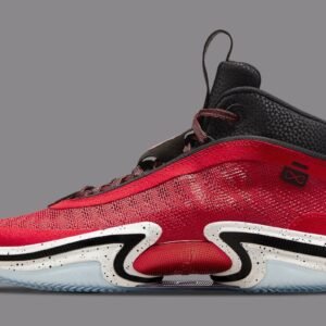 A PE colorway made for Rui Hachimura and exclusive to Asia and Latin America . the Air Jordan 36 ‘Japan’ features a red leno-weave upper with tonal synthetic overlays and contrasting hits of black on the collar and tongue. Oversized lace keepers inspired by the Air Jordan 6 feature a red Jumpman on the right shoe and Rui’s personal logo on the left. Responsive cushioning comes courtesy of a full-length Zoom Air Strobel stitched directly to the upper . which works in tandem with an additional Zoom Air unit stacked under the forefoot. In the center of the lightly speckled foam midsole . a hollowed-out section reduces weight and exposes the shoe’s midfoot shank plate. An icy translucent rubber outsole provides grippy traction underfoot.