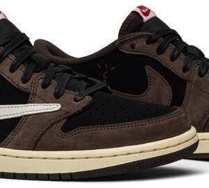 Travis Scott and Jordan Brand collaborate on an Air Jordan 1 Low . taking similar design cues from the high-top version. An oversized backward facing Swoosh is featured prominently on the lateral side of the shoe . while a regular Swoosh graces the medial side. Black and Dark Mocha nubuck dominate the upper . with a few pops of University Red adding a nice contrast. Travis Scott details are subtly placed on the shoe . with the ‘Cactus Jack’ logo appearing on the tongue . medial side panel and sockliner. The back heel tabs feature intricately stitched logos . with the Air Jordan Wings on the right shoe and Scott’s crudely drawn face on the left shoe.