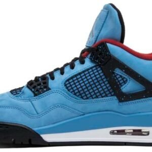 Music artist Travis Scott hails from Houston . where the Oilers used to take the field in red . white and blue uniforms. The Travis Scott x Air Jordan 4 Retro ‘Cactus Jack’ colorway pays tribute to the city’s bygone football team with a Durabuck leather upper dressed in University Blue and a Varsity Red insole. The black lace cage and a heel panel feature a light blue speckle pattern. Cactus Jack branding appears on the left heel in Varsity Red . with a matching Jumpman logo on the right.